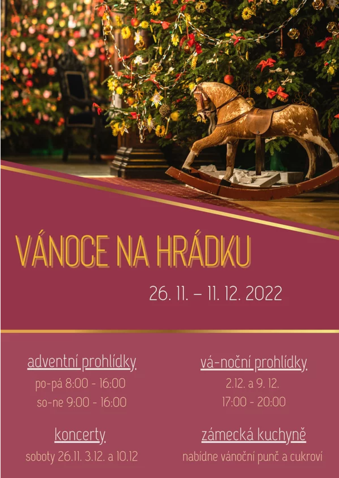 Dovolujeme si Vás pozvat na XXVIII. Vánoce na Hrádku u Nechanic. Od 26. listopadu do 11. prosince 2022 Vás ve vánočně vyzdobených interiérech seznámíme s historií Vánoc, jejich zvyky a tradicemi.
